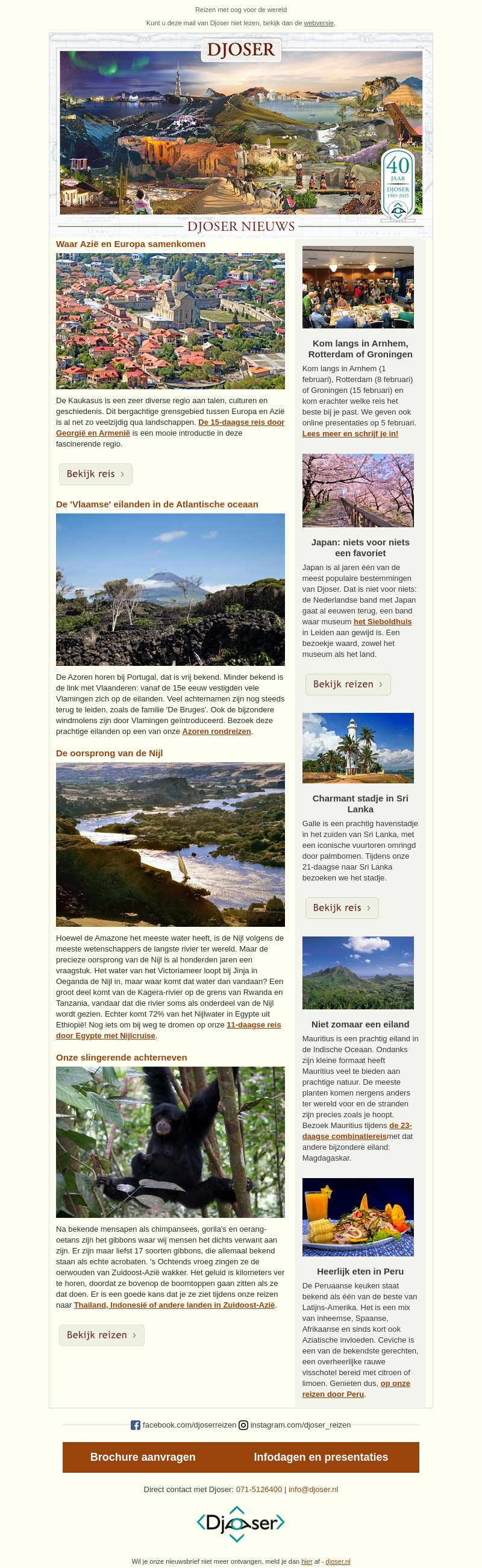 Djoser Nieuws biedt een kijkje in bijzondere bestemmingen zoals de Kaukasus, de Azoren, en de oorsprong van de Nijl. Ontdek fascinerende verhalen over gibbons in Zuidoost-Azië en de charme van het Sri Lankaanse stadje Galle. Vertrouw op Djoser voor unieke reiservaringen met cultuur en avontuur.