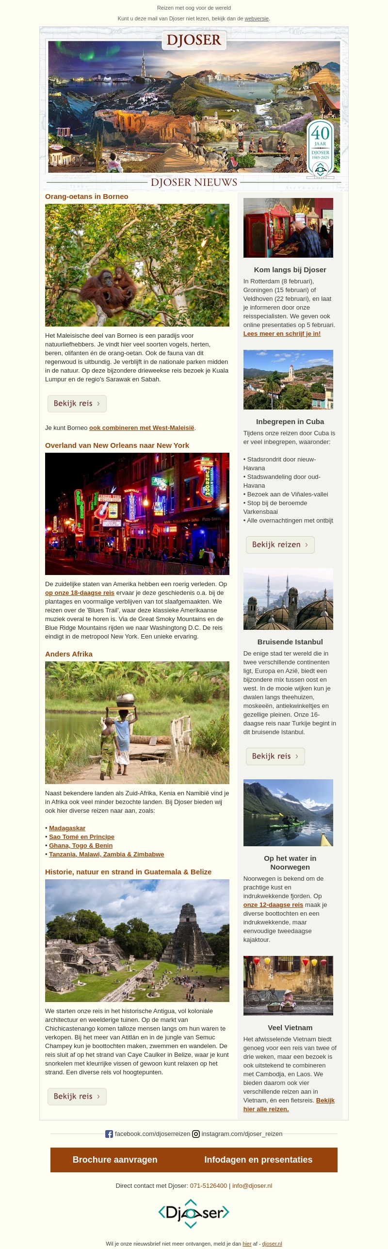 Verken de natuurpracht van Borneo, de historische charme van de Verenigde Staten en de diversiteit van Afrika met Djoser. Bezoek nationale parken in Maleisisch Borneo, ontdek de rijke muzikale geschiedenis van New Orleans tot New York, en ervaar minder bekende plekken in Afrika zoals Ghana en Togo. Djoser's zorgvuldig samengestelde reizen bieden unieke avonturen waar comfort en avontuur samenkomen.