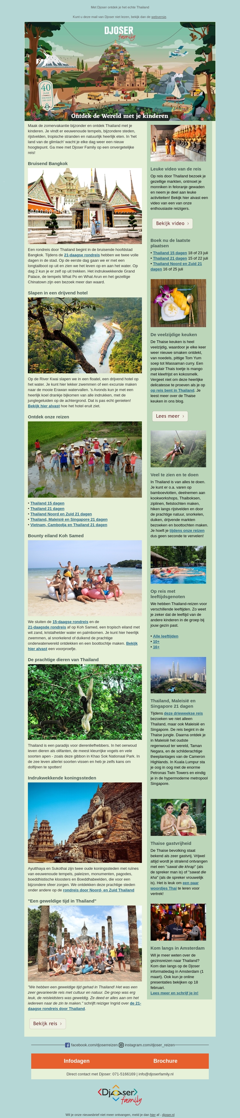 Thailand biedt een onvergetelijke ervaring voor het hele gezin. Ontdek de levendige cultuur in Bangkok, slaap in drijvende hotels, en geniet van de prachtige stranden van Koh Samed. Proef de heerlijke Thaise keuken en ervaar de gastvrijheid. Verken oude koningssteden en verwonder je over de adembenemende natuur.