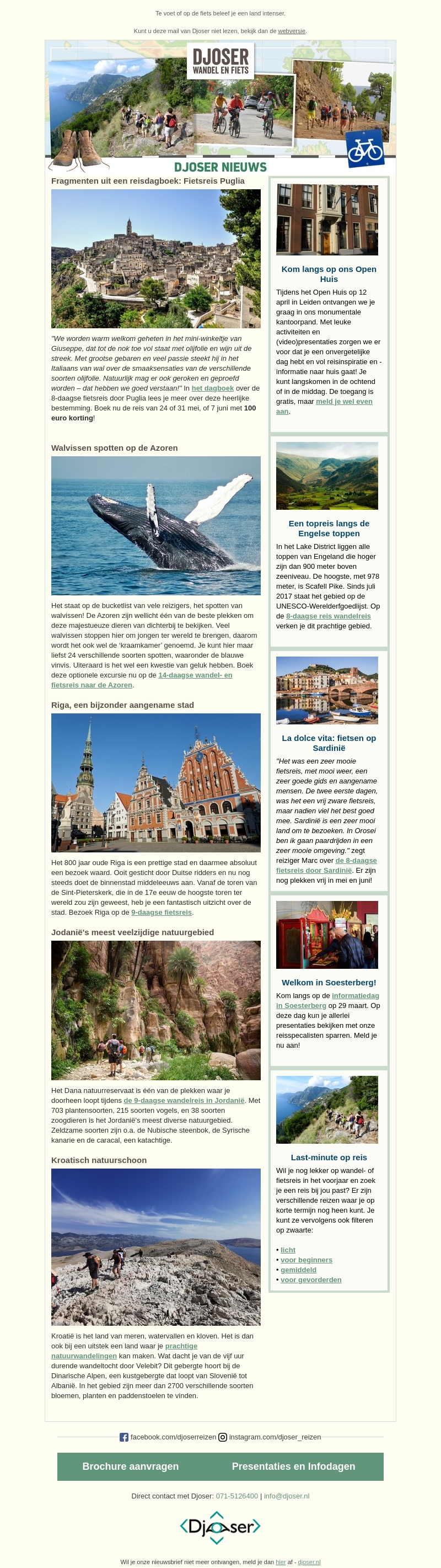 Duik in de wereld van Djoser Reizen met een scala aan unieke fietsavonturen. Ervaar de pracht van Puglia, spot majestueuze walvissen op de Azoren, en geniet van de Engelse toppen. Ontdek het veelzijdige Dana natuurreservaat in Jordanië, en laat je verrassen door de paradijselijke uitzichten van Sardinië. Boek nu en ontvang 100 euro korting op geselecteerde reizen!