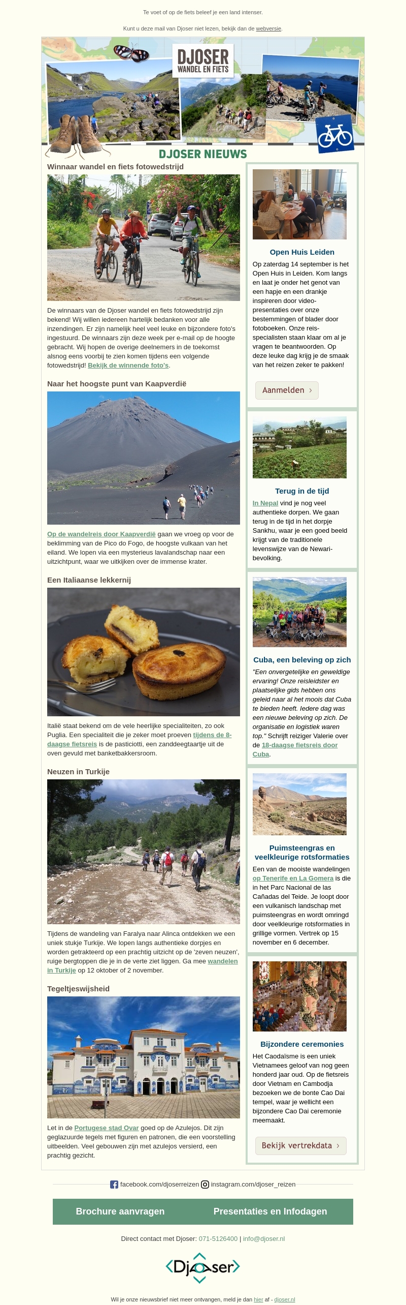 De winnaars van de Djoser wandel en fiets fotowedstrijd zijn bekend. Ontdek bijzondere reizen naar Kaapverdië, Italië, Turkije en meer. Kom naar ons Open Huis in Leiden en leer meer over onze reizen door onze reisspecialisten. Geniet van Italiaanse specialiteiten en verken bijzondere ceremonies in Vietnam en Cambodja.