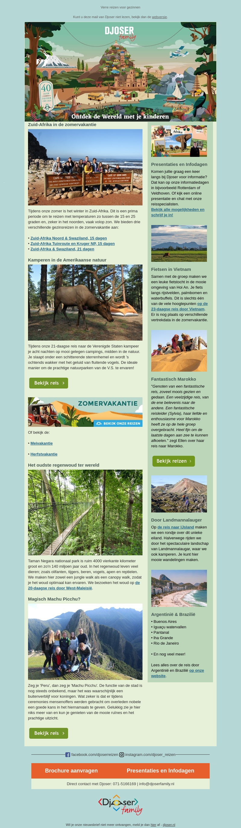 Verken de betoverende bestemmingen voor jouw zomervakantie. Bezoek Zuid-Afrika tijdens hun winter, kampeer in de adembenemende natuur van de Verenigde Staten en beleef de magie van Marokko. Laat je inspireren door de wonderschone landschappen en de rijke cultuur van deze bijzondere reizen.