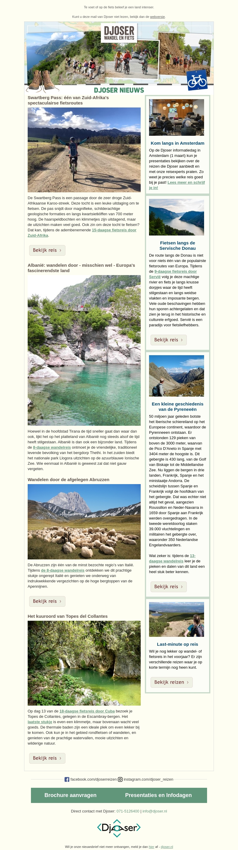 In deze nieuwsbrief presenteren we spectaculaire fiets- en wandelroutes naar Zuid-Afrika, Cuba, en Albanië. Verken de indrukwekkende Swartberg Pass in Zuid-Afrika, het betoverende kuuroord van Topes del Collantes in Cuba, en de fascinerende natuur van Albanië. Beleef avonturen te voet of op de fiets langs Europa's mooiste plekken.