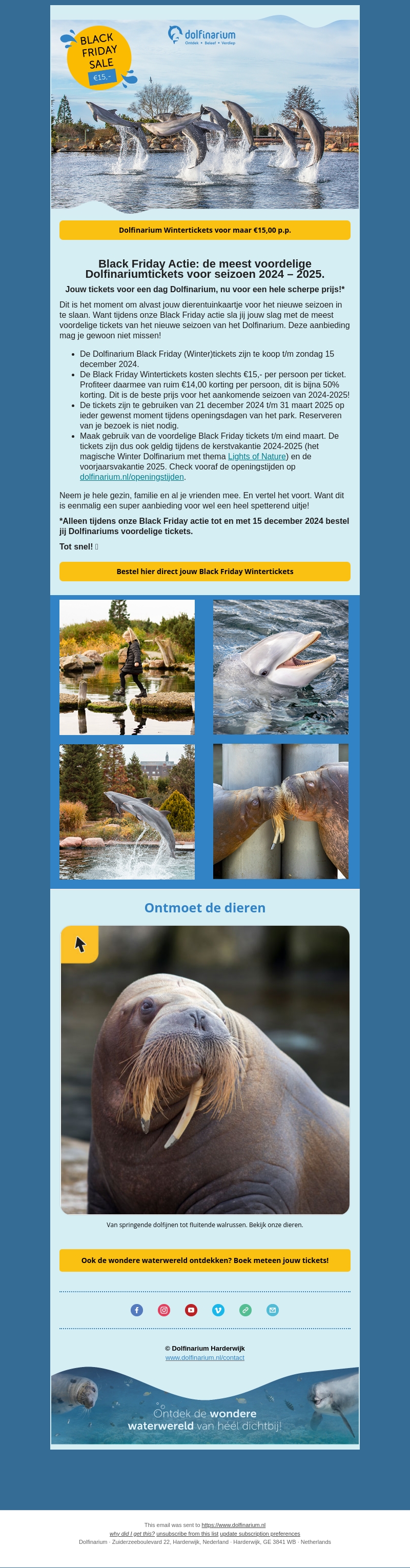 Bezoek Dolfinarium deze winter met speciale Black Friday prijzen. Tik nu je tickets voor slechts €15,00 op de kop. Geniet van een dag vol plezier zonder reservering nodig. Aanbieding geldig op geselecteerde data in 2024 en 2025. Mis deze unieke kans niet!