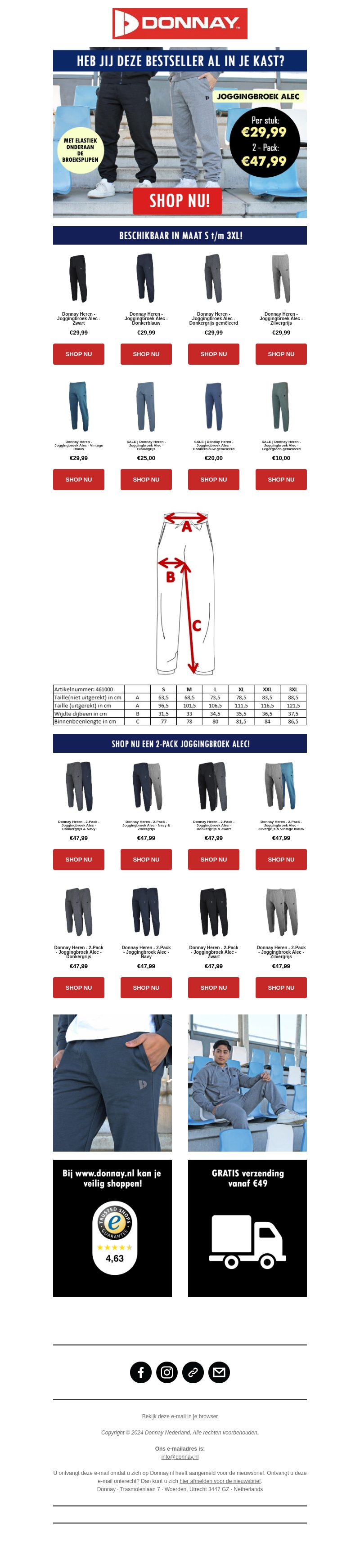 De Joggingbroek Alec van Donnay is ontworpen voor ultiem comfort en veelzijdigheid. Met elastische enkels en een pasvorm die varieert van S tot 3XL, biedt deze broek een perfecte oplossing voor elke gelegenheid. Bovendien is hij beschikbaar als losse broek of in een voordelige 2-pack. Bekijk ook de gratis verzending bij orders vanaf β¬49!