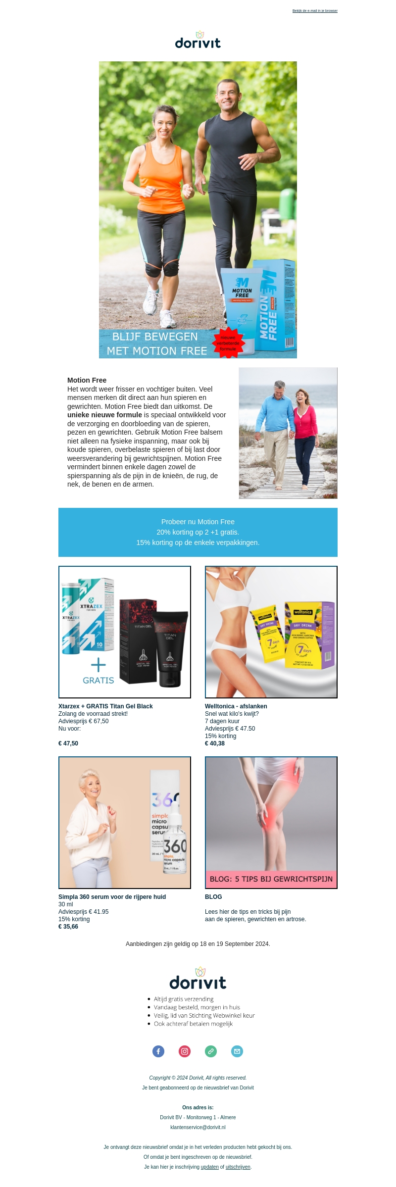 Geniet van de frisse en vochtigere dagen met Motion Free. Profiteer van onze exclusieve kortingen zoals Xtrazex met gratis Titan Gel Black, Welltonica afslankkuur en het Simpla 360 serum. Elk product wordt geleverd met unieke aanbiedingen en kortingen.