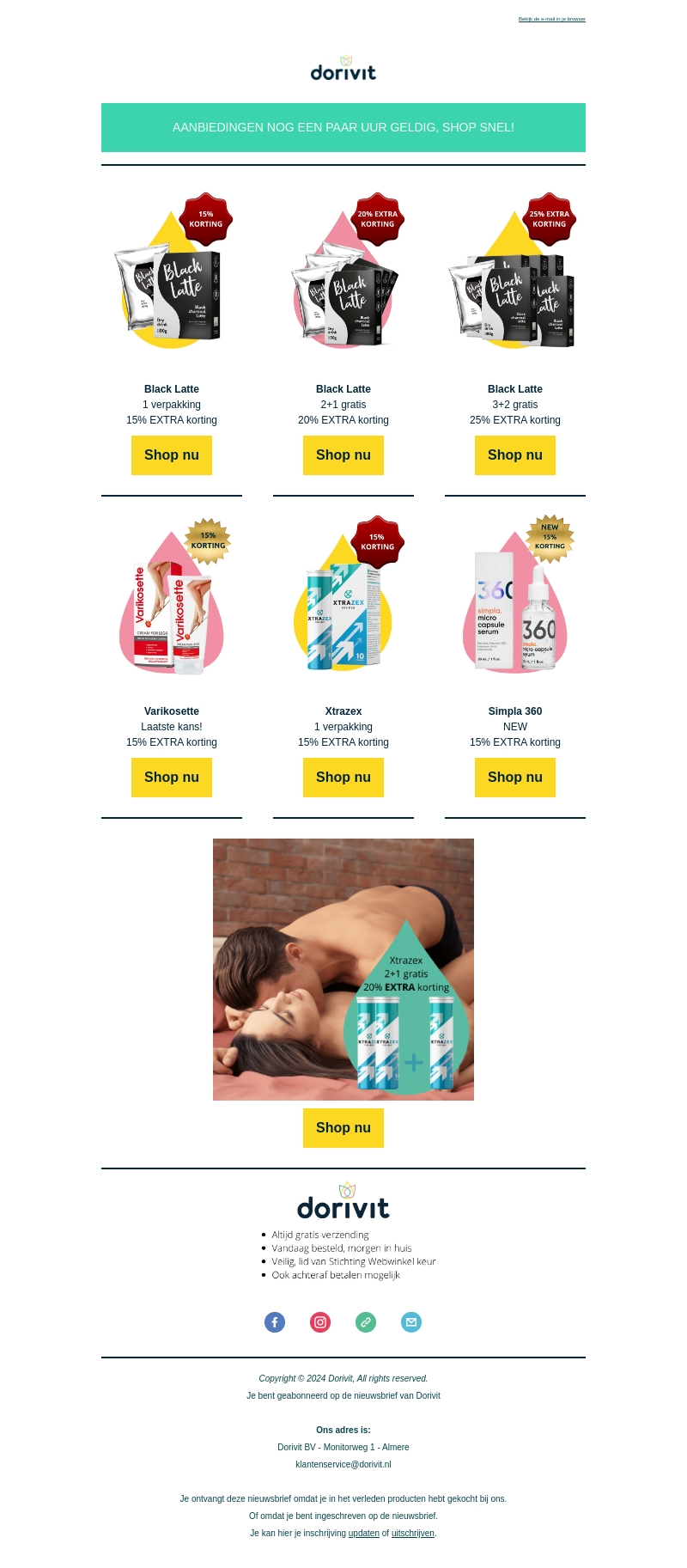 Mis deze kans niet om te profiteren van geweldige kortingen op top producten zoals Black Latte, Varikosette, Xtrazex, en Simpla 360. Acties zijn nog slechts een paar uur geldig, dus shop snel en bespaar direct!
