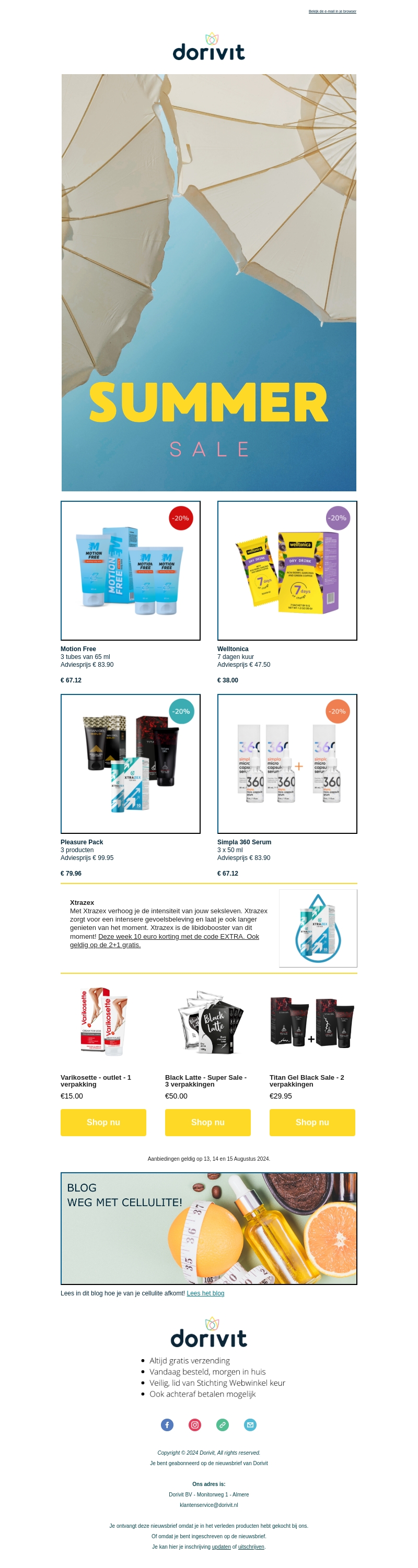 De Summer Sale is begonnen bij Dorivit! Profiteer nu van kortingen tot wel 20% op jouw favoriete producten. Motion Free, Welltonica, Pleasure Pack en meer zijn nu afgeprijsd. Ontdek hoe je jouw vakantie extra speciaal maakt met onze aanbiedingen. Bekijk ook de blog om van je cellulite af te komen.