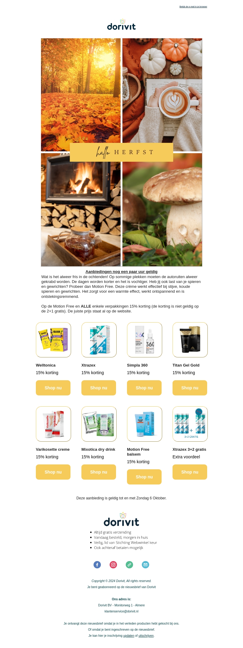 Bij Dorivit zijn de herfstaanbiedingen gearriveerd met 15% korting op populaire producten zoals Welltonica, Xtrazex, en Motion Free balsem. Profiteer van de exclusieve aanbieding en geniet van gratis verzending. Zorg dat je bestelt voordat de aanbieding verloopt op zondag 6 oktober.