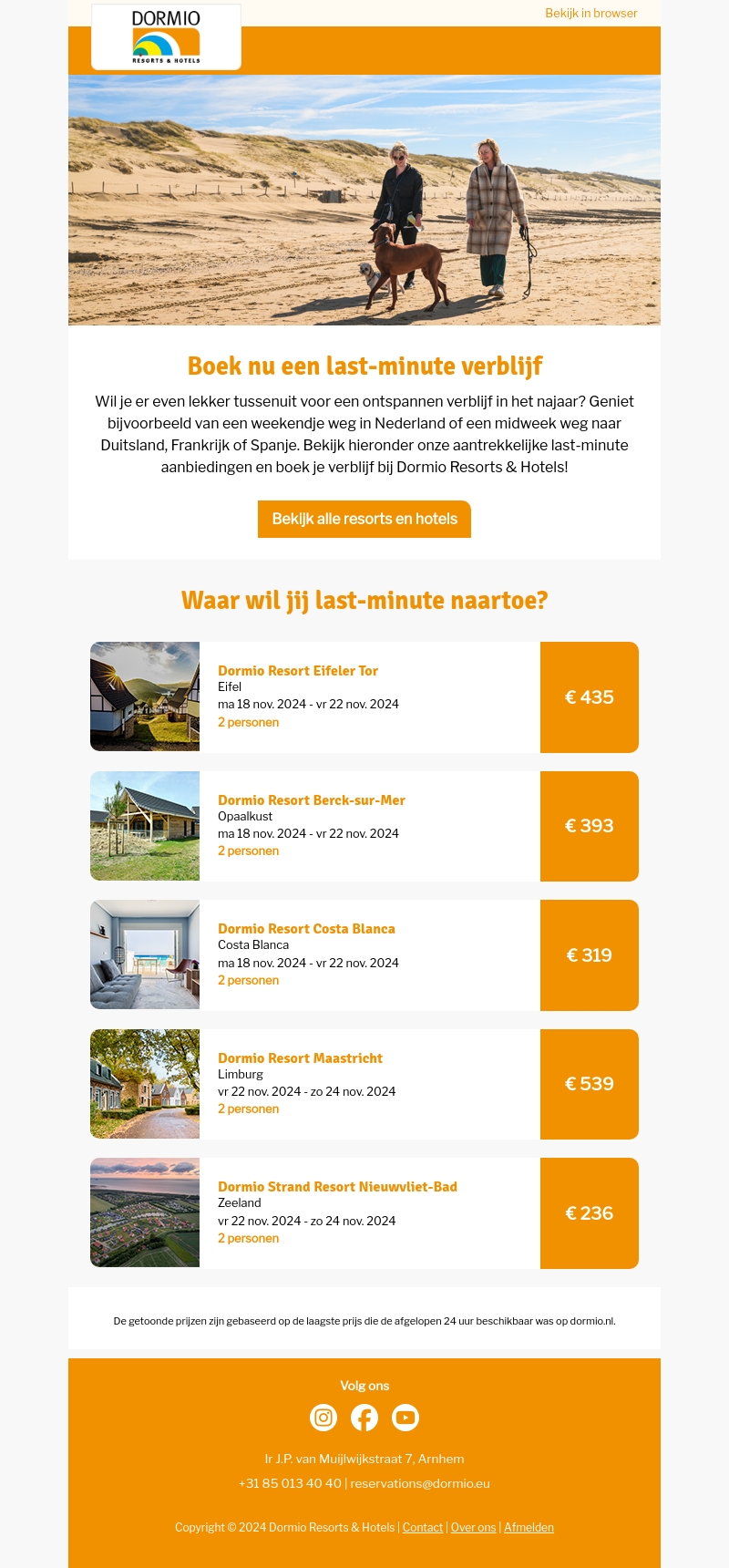 Ben je toe aan een korte ontsnapping? Dormio Resorts & Hotels biedt aantrekkelijke last-minute aanbiedingen voor een ontspannen verblijf in Nederland, Duitsland, Frankrijk, of Spanje. Of het nu een weekendje weg is of een midweek retreat, er is voor ieder wat wils. Bekijk de beschikbare resorts en boek jouw verblijf vandaag nog voor de beste prijs.