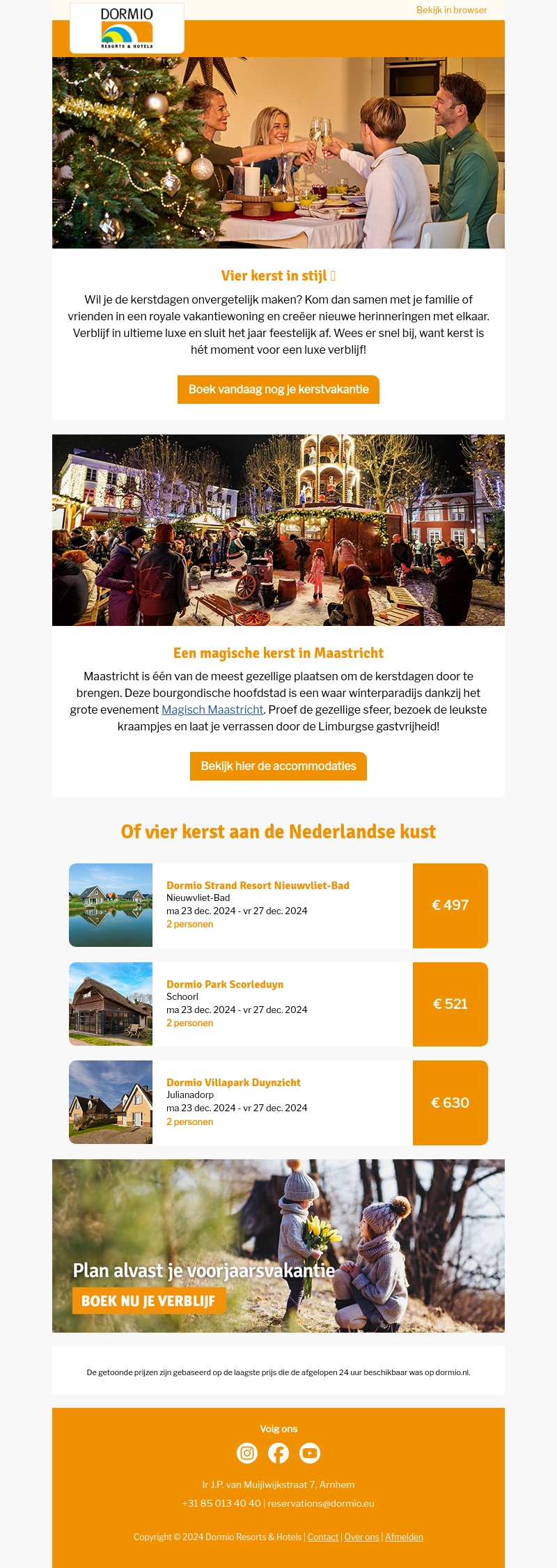 Maak de feestdagen onvergetelijk met een luxe vakantiewoning via Dormio Resorts. Ontsnap naar de Bourgondische sfeer van Maastricht of geniet van de winterse rust aan de Nederlandse kust. Boek nu jouw verblijf en ervaar een magische kerst.