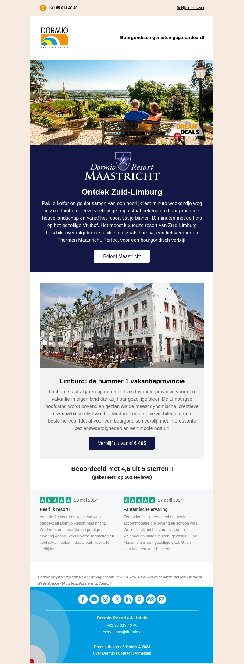 Pak je koffer en geniet van een last-minute weekend in Zuid-Limburg bij Dormio Resort Maastricht. Bezoek de levendige Vrijthof in Maastricht en ervaar de beste horeca. Het resort biedt luxe faciliteiten en is perfect voor een Bourgondisch verblijf!