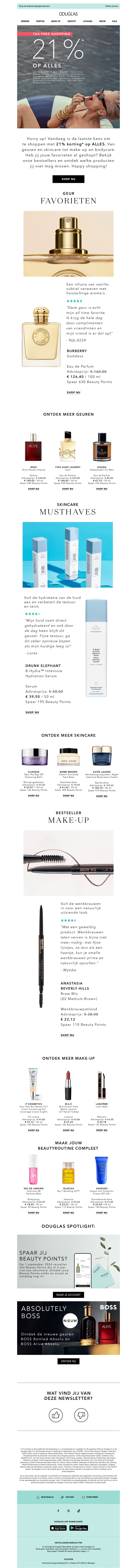 Ontvang 21% korting op al je favoriete producten bij Douglas. Van parfums tot make-up, grijp nu je kans om te besparen. Bekijk snel onze uitgelichte favorieten en musthaves. Mis deze laatste kans niet!