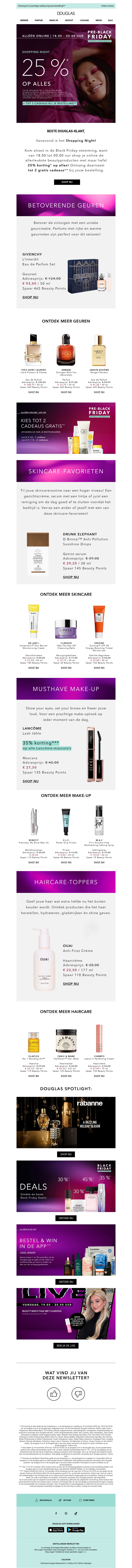 Mis de kans niet om te winkelen tijdens de Pre-Black Friday Shopping Night en krijg 25% korting op alles! Ontdek exclusieve deals op populaire beautyproducten, parfum en huidverzorging. Deze speciale avond biedt je de perfecte gelegenheid om te besparen op je favoriete merken. Zorg ervoor dat je op tijd bent en geniet van ongelooflijke aanbiedingen. Bezoek onze website voor meer details. Doe snel mee en profiteer van deze geweldige kortingen!