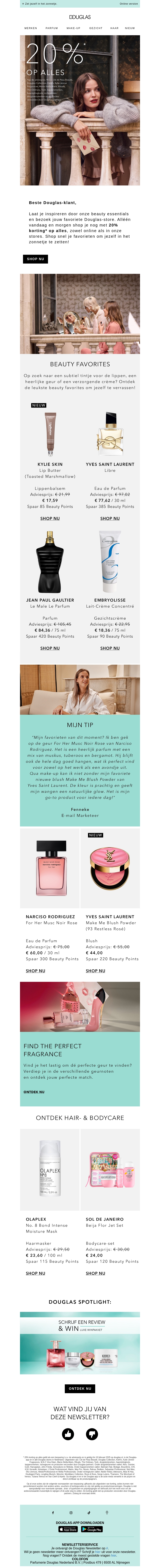 Het is weer tijd voor een speciale aanbieding! Dit weekend krijg je bij Douglas maar liefst 20% korting op alles. Of je nu op zoek bent naar een nieuwe geur of je huidverzorgingsroutine wilt uitbreiden, pak je kans. Mis deze unieke kans niet en shop jouw favorieten bij Douglas.