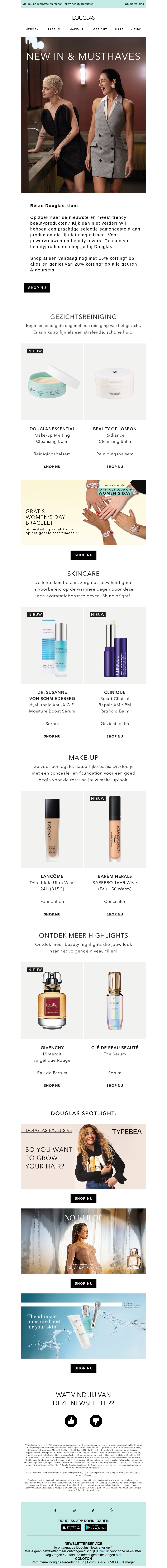 Profiteer alleen vandaag van een exclusieve 15% korting op alle artikelen bij Douglas. Ontdek de nieuwste en meest gewilde producten in skincare, make-up en parfum. Vergeet niet om je winkelmand te vullen en de korting te activeren voor middernacht. Shop nu om te voorkomen dat je deze geweldige kans misloopt!
