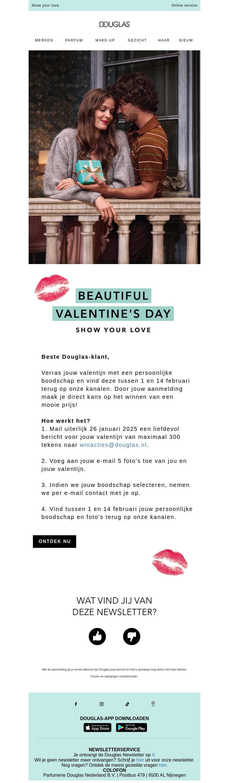 Verras jouw valentijn met een persoonlijke boodschap en maak kans om deze terug te zien op onze kanalen tussen 1 en 14 februari. Stuur je bericht van maximaal 300 tekens samen met vijf foto's naar winacties@douglas.nl. Als jouw inzending wordt geselecteerd, nemen we contact met je op.