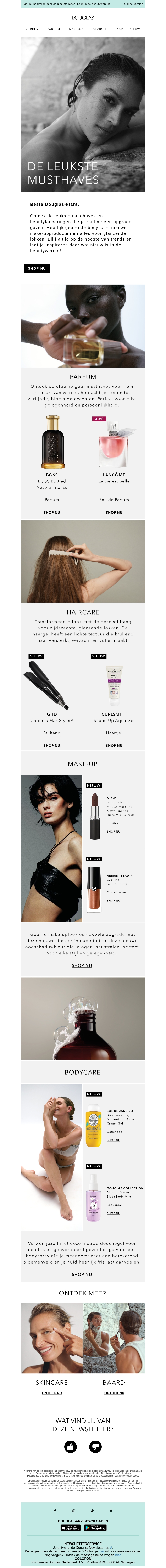 Deze nieuwsbrief bevat een exclusieve selectie van de mooiste beautyproducten die je absoluut moet hebben. Van luxe parfums zoals Boss en Lancôme tot essentiële haarverzorging van ghd en Cultimatch. Ontdek de nieuwste make-up trends en verzorgingsproducten om je look compleet te maken.