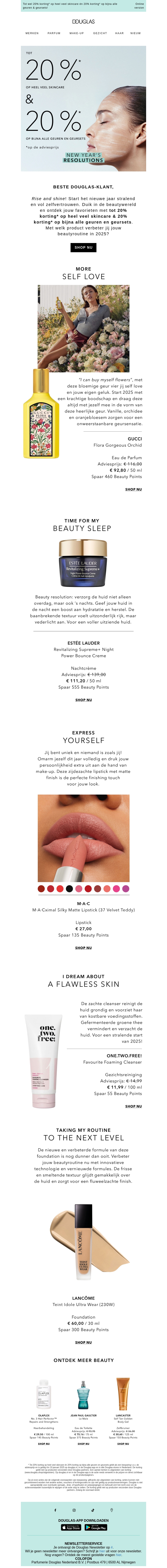 Begin het nieuwe jaar met onze fantastische beautyproducten. Verwen jezelf met exclusieve kortingen tot 20% en ontdek de nieuwste trends in huidverzorging en make-up. Of je nu op zoek bent naar een nieuwe parfum of de perfecte lipkleur, we hebben voor ieder wat wils.