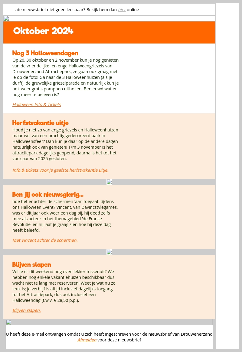 Ontdek de magie van Halloween bij Drouwenerzand tussen 26 oktober en 2 november. Bezoek griezelige spookhuizen en geniet van de spannende parade. De herfstvakantie biedt ook volop plezier met dagelijks geopende attracties tot 3 november. Boek nu je verblijf voor een compleet avontuur!
