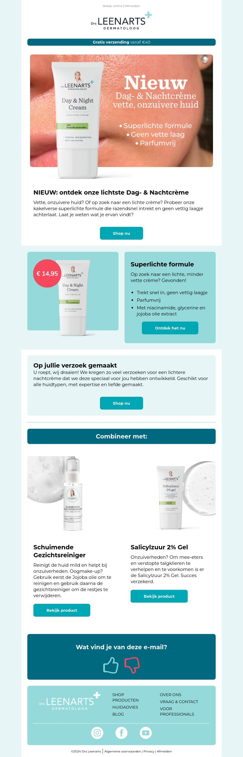 Vette, onzuivere huid? Ontdek onze nieuwe lichte Dag- & Nachtcrème. De superlichte formule trekt snel in en laat geen vette laag achter. Parfumvrij en geschikt voor alle huidtypes.