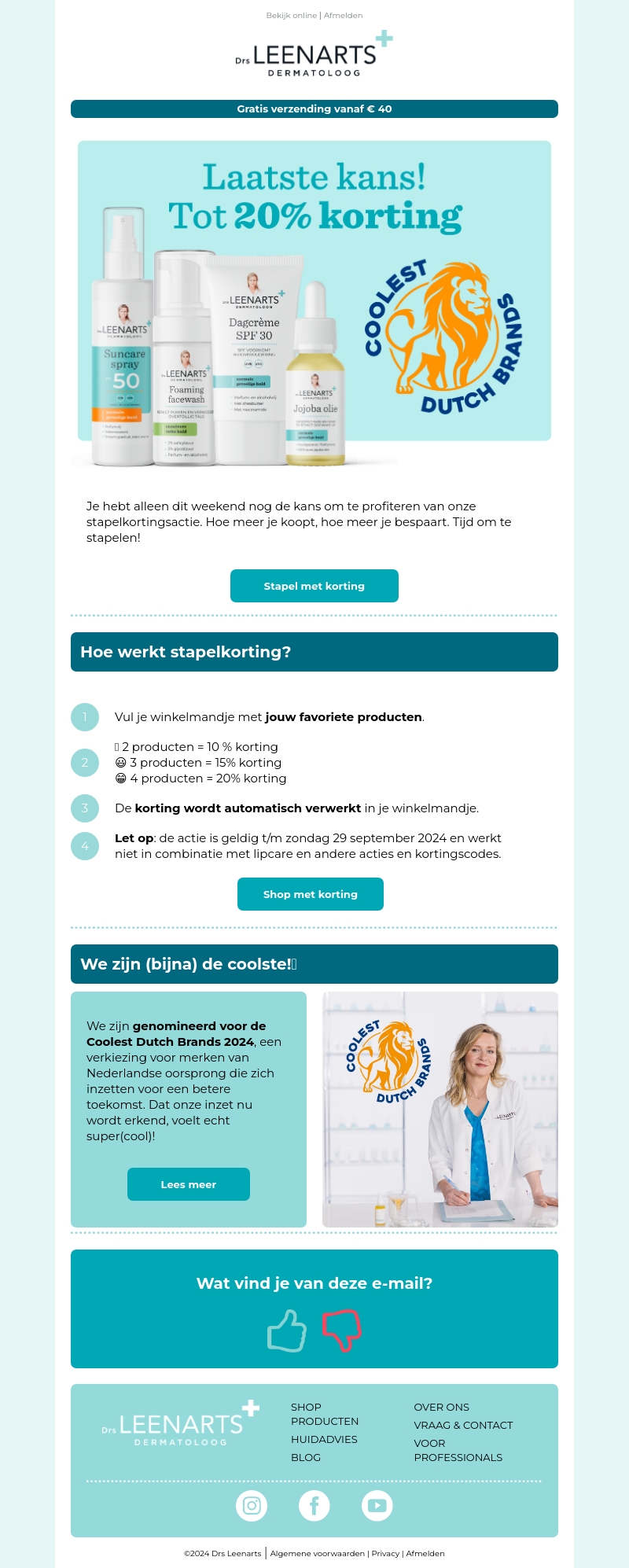 Laatste kans om te profiteren van tot 20% korting op alle producten bij Drs Leenarts. Denk aan zonnebrandspray, schuimende gezichtswash, dagcrème met SPF30 en jojoba olie. De stapelkorting loopt op tot maar liefst 20%. Deze actie is geldig tot en met zondag 29 september 2024.