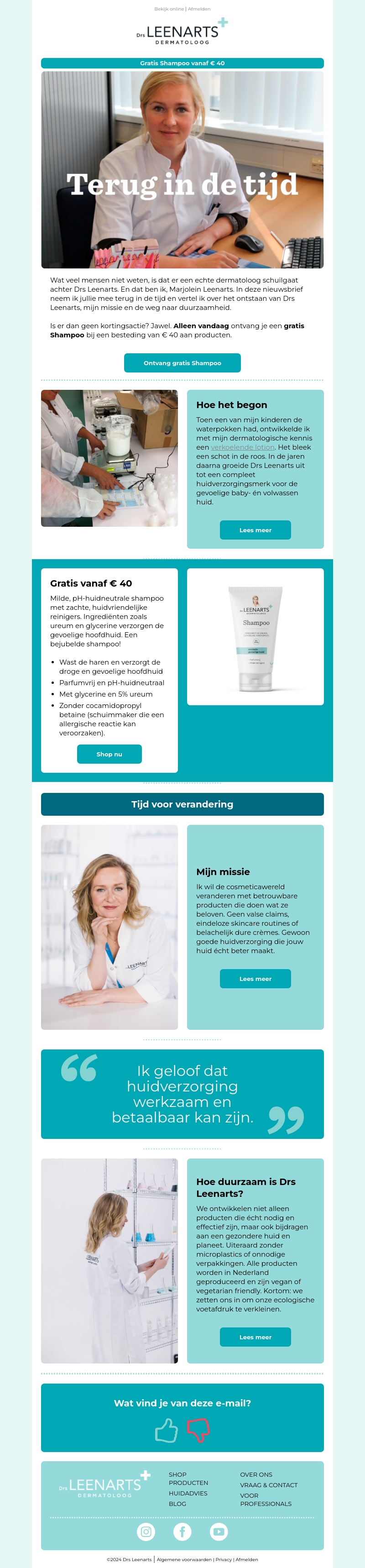 Profiteer vandaag van onze exclusieve aanbieding bij Drs Leenarts. Bij besteding vanaf € 40 ontvang je een gratis shampoo. Leer meer over het ontstaan en de duurzaamheidsmissie van Drs Leenarts.