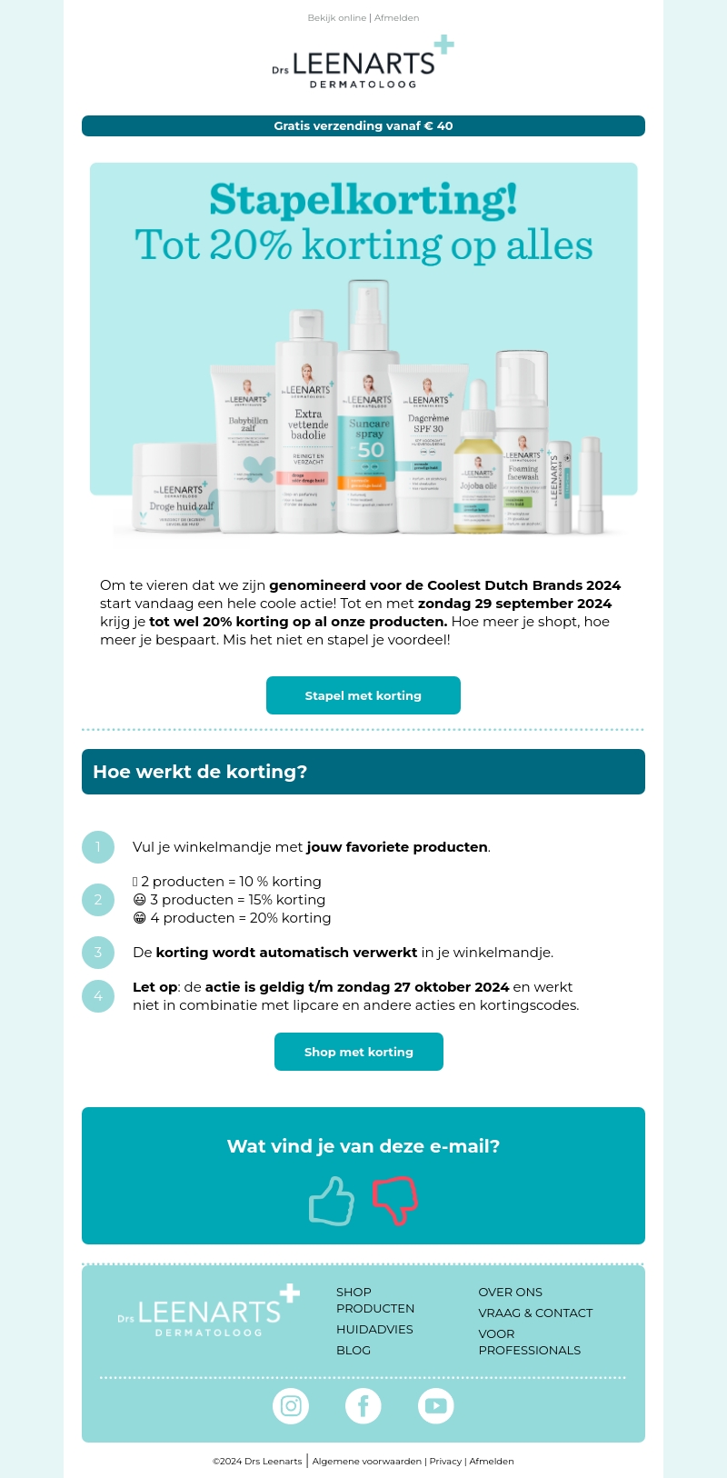 Drs Leenarts viert een bijzondere nominatie met een spectaculaire actie! Ontvang tot 20% korting op al je favoriete producten. Hoe meer je koopt, hoe meer je bespaart. Deze aanbieding is geldig tot en met 27 oktober 2024. Mis deze kans niet en ontdek de voordelen vandaag nog!