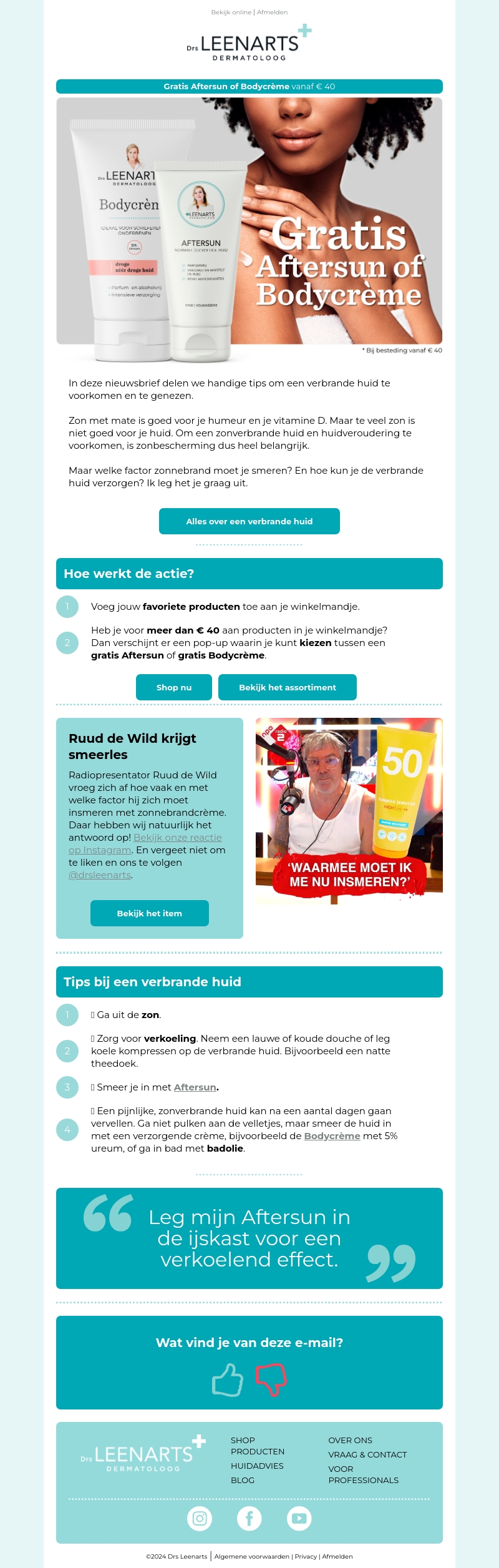 Profiteer dit weekend van een speciale actie bij Drs Leenarts! Bij een besteding van meer dan €40 aan jouw favoriete dermatologische producten, ontvang je gratis een Aftersun of Bodycrème. Perfect voor het verzorgen van je huid na een dagje zon.