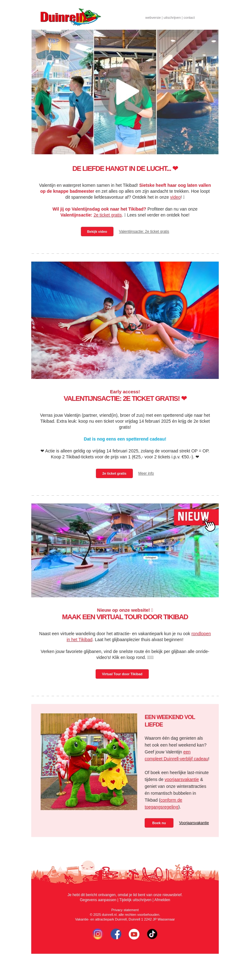 Valentijnsdag hangt in de lucht bij Duinrell! Geniet van speciale acties in het Tikibad, zoals 2 tickets voor de prijs van 1. Maak ook een virtuele tour door het Tikibad en plan een romantisch weekend weg. Vier liefde op een speciale manier met unieke ervaringen.