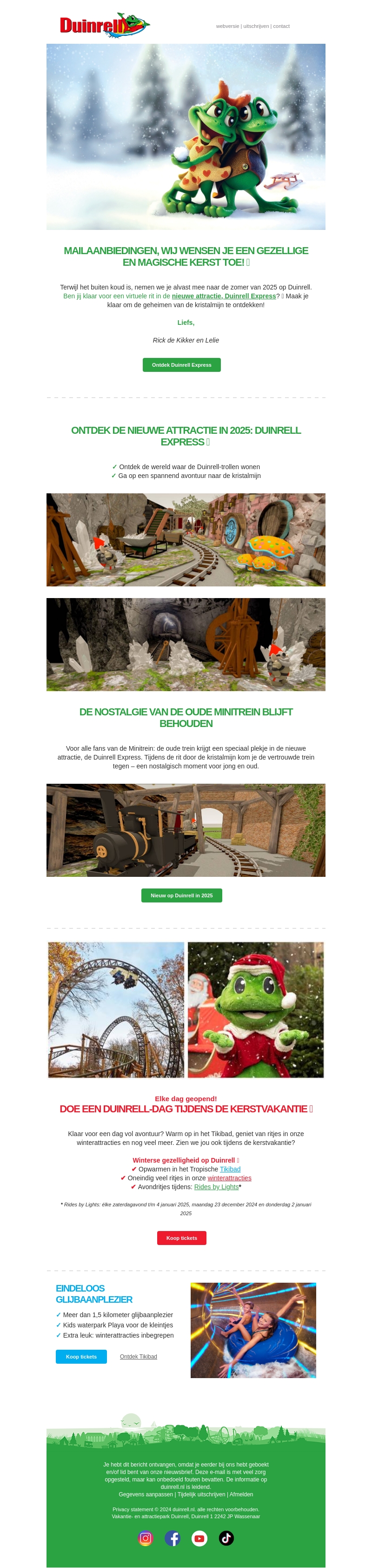Beleef een gezellige kerst met Duinrell en ontdek de nieuwe attractie voor 2025: de Duinrell Express. Geniet van eindeloze glijbaanplezier en spannende ritjes in de kerstvakantie. Laat je verwarmen in het tropische Tikibad en geniet van speciale kerstactiviteiten met de Rides by Lights. Sluit je aan bij de avontuurlijke wereld van Duinrell deze feestdagen!