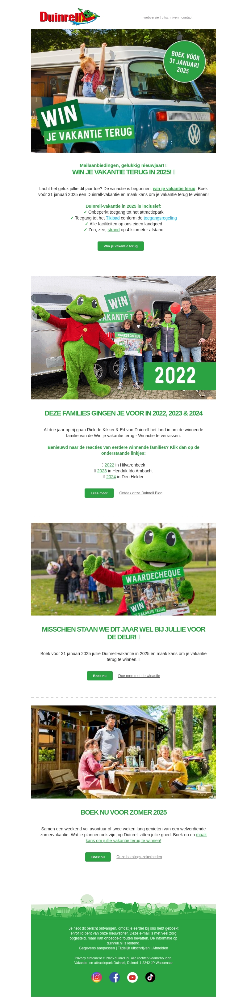 Begin het nieuwe jaar goed met de Duinrell winactie! Boek je vakantie voor 31 januari 2025 en maak kans om je vakantie terug te winnen. Ontmoet Rick de Kikker en geniet van alle attracties. Samen zorgen we voor een onvergetelijke zomer vol avontuur. Ga jij de uitdaging aan?
