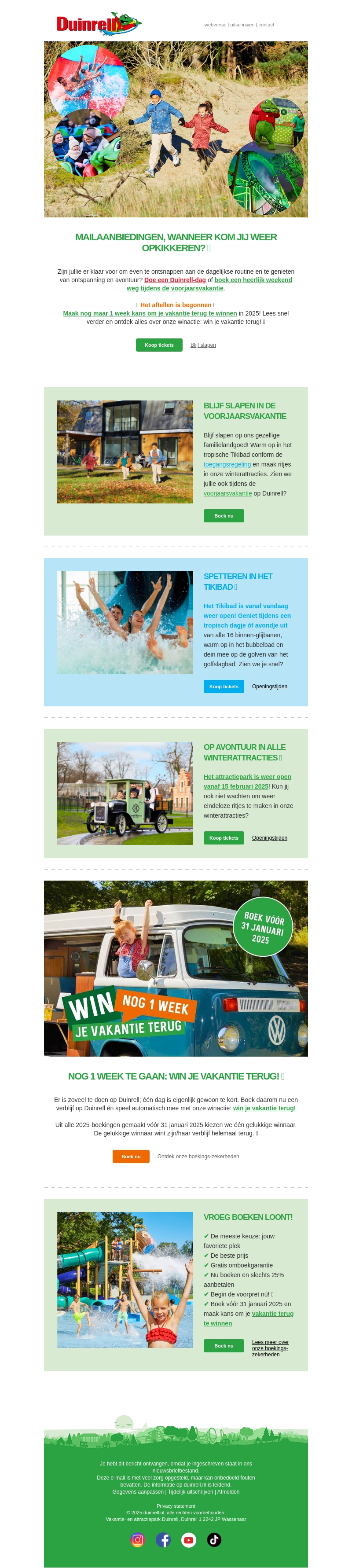 Ben je klaar voor een avontuur bij Duinrell? Geniet van een ontspannen voorjaarsvakantie vol spannende attracties. Boek je verblijf nu en maak kans op het terugwinnen van je vakantie! Vergeet niet om een duik te nemen in het Tiki-bad en alle winterattracties te ontdekken.
