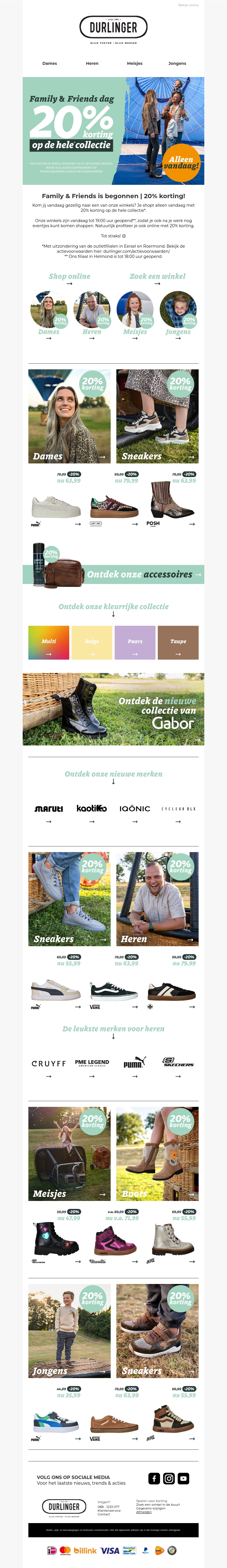 Family & Friends dag is begonnen met 20% korting op de hele collectie! Ontdek de nieuwste trends voor dames, heren, meisjes en jongens. Profiteer van geweldige kortingen op sneakers, boots, accessoires en meer. Shop online of bezoek een van onze winkels.