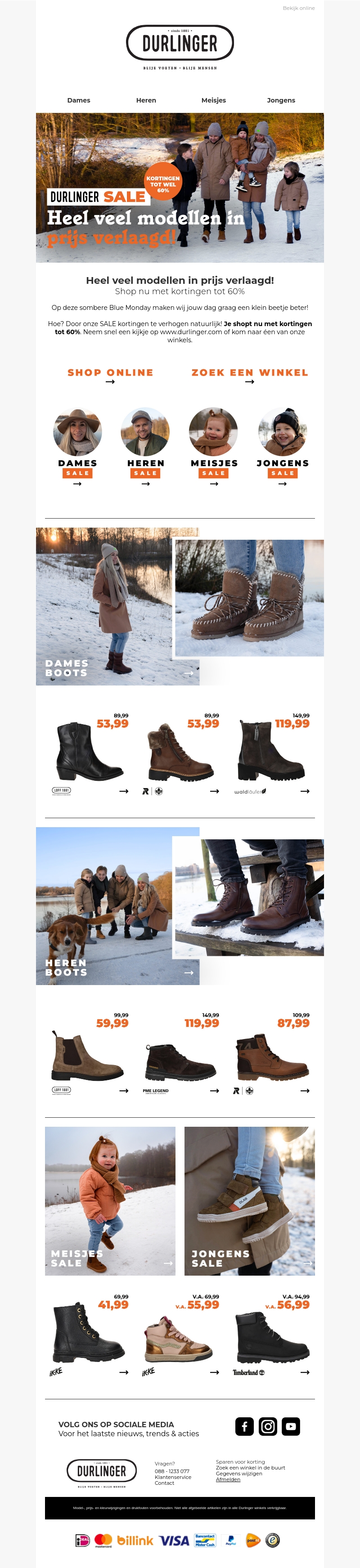Deze nieuwsbrief van Durlinger kondigt grote prijsverlagingen aan, met kortingen tot wel 60%. Van dames- tot herenschoenen, en ook aanbod voor kinderen, er is iets voor iedereen in deze uitverkoop. Shop online of bezoek een van de winkels om de deals niet te missen. Mis deze kans niet om stijlvolle schoenen te scoren tegen verlaagde prijzen.