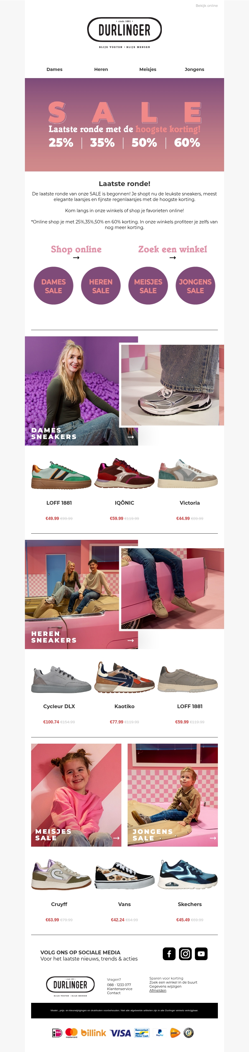 Het is de laatste ronde van de uitverkoop bij Durlinger! Profiteer van ongelofelijke kortingen die oplopen tot 60% op een breed assortiment aan dames-, heren-, meisjes- en jongensschoenen. Bezoek één van onze winkels of shop gemakkelijk online om je favoriete paar schoenen te bemachtigen voordat het te laat is. Of je nu op zoek bent naar sneakers, laarzen of casual schoenen, je vindt het allemaal met geweldige kortingen.