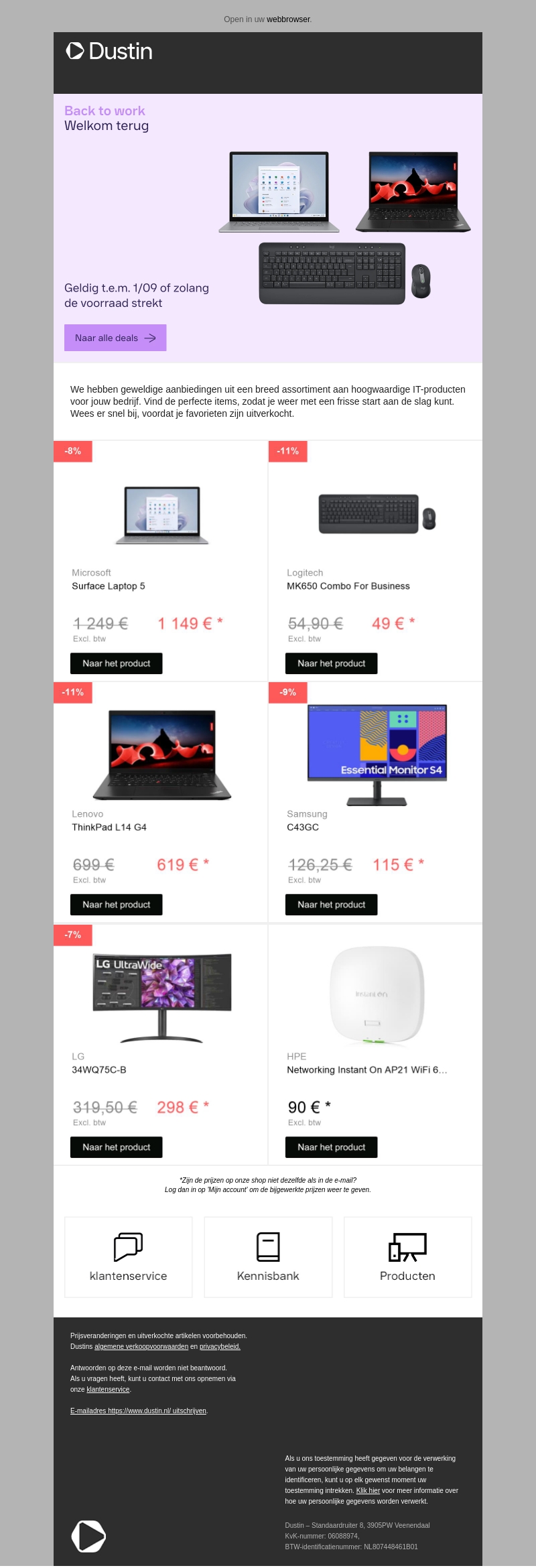We heten je welkom terug met een breed assortiment aan hoogwaardige IT-producten voor jouw bedrijf. Vind de perfecte items, zodat je weer met een frisse start aan de slag kunt. Wees er snel bij, voordat je favorieten zijn uitverkocht. Geldig t.e.m. 1/09 of zolang de voorraad strekt.