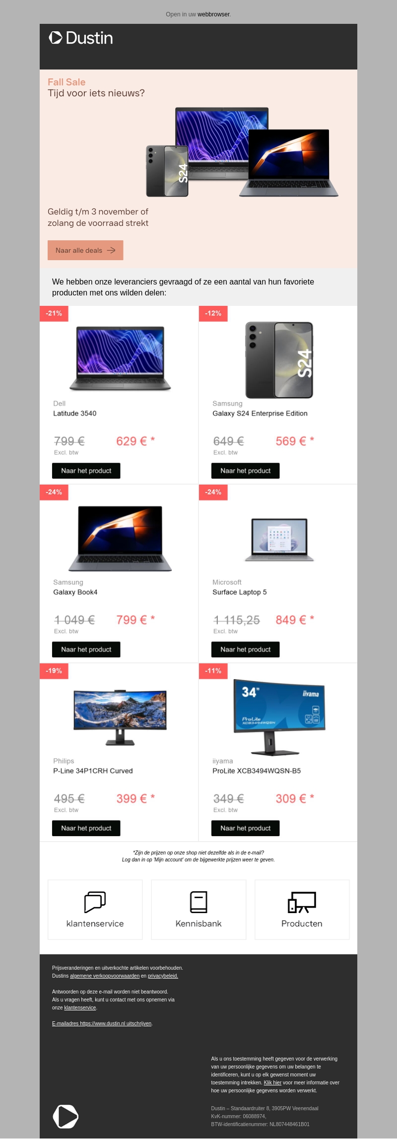 De herfst is gearriveerd en dat betekent grote kortingen bij Dustin! Profiteer van onze herfstactie met kortingen tot wel 24% op merken zoals Dell, Samsung, en Microsoft. Deze aanbiedingen zijn geldig tot 3 november of zolang de voorraad strekt. Mis het niet en vernieuw je apparaten met deze geweldige deals!