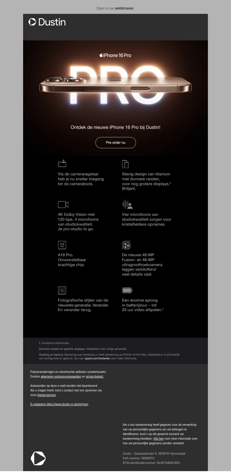 Ontdek de geavanceerde iPhone 16 Pro bij Dustin. Met een strak titanium ontwerp, A18 Pro-chip, 48-MP camera en verbeterde batterijduur, is de iPhone 16 Pro een must-have. Pre-order nu om als eerste te profiteren van deze technologische innovatie.