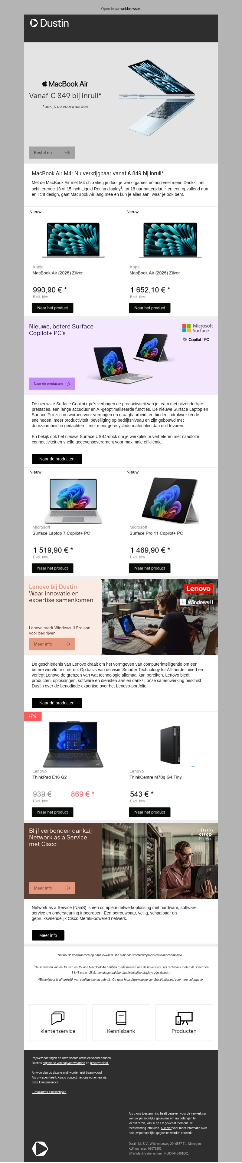 De MacBook Air M4 is nu verkrijgbaar bij Dustin met een startprijs van € 849 bij inruil. Geniet van de snelle prestaties en een indrukwekkend Liquid Retina display. Bekijk ook de nieuwste Surface Copilot-PC's en Lenovo producten voor innovatie en expertise.