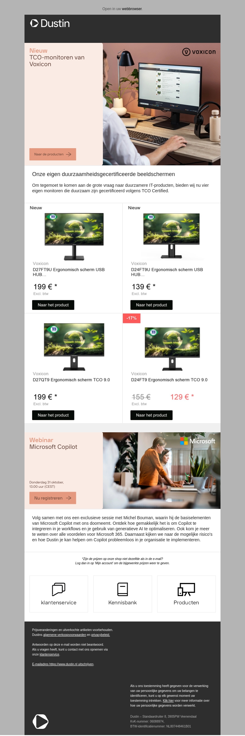 Verken de nieuwste lijn van TCO-gecertificeerde monitoren van Voxicon, beschikbaar in verschillende modellen voor zowel duurzaamheid als kwaliteit. Ontdek het ergonomische ontwerp dat perfect integreert met uw thuis- of kantooromgeving. Bespaar 17% op geselecteerde modellen en ervaar de voordelen van duurzame technologie. Mis ook de kans niet om deel te nemen aan de exclusieve Microsoft Copilot webinar.
