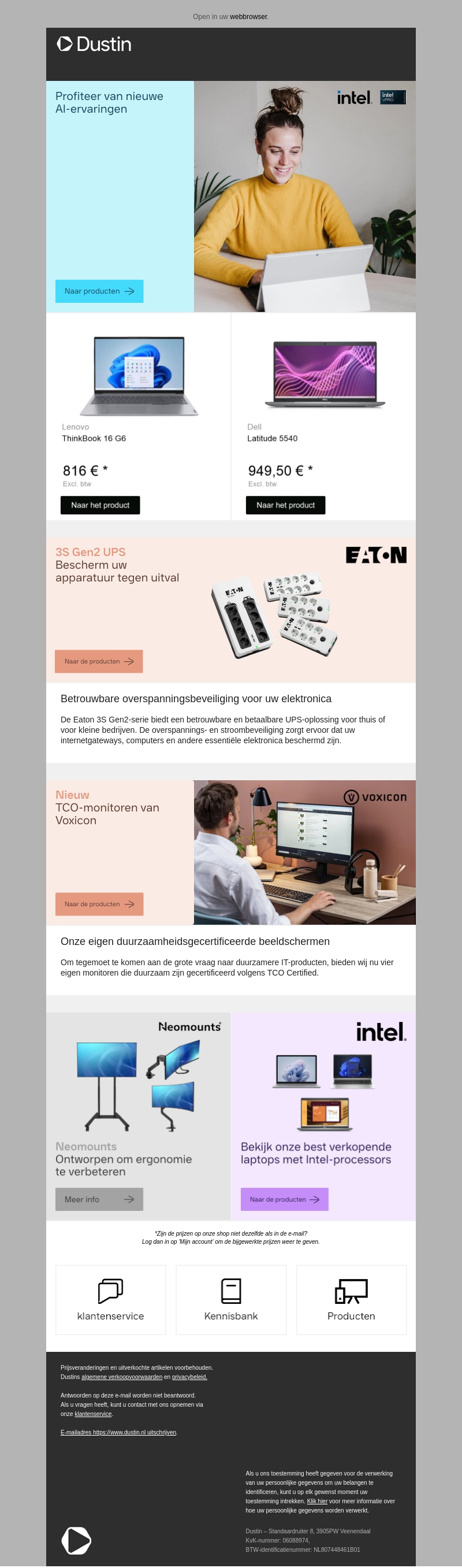 Profiteer van de nieuwste AI-ervaringen voor bedrijven met Intel-processors. Bekijk Lenovo en Dell laptops die ideaal zijn voor zakelijk gebruik. Bescherm uw apparatuur tegen uitval met Eaton’s 3S Gen2 UPS en ontdek de nieuwe duurzaam gecertificeerde monitors van Voxicon.