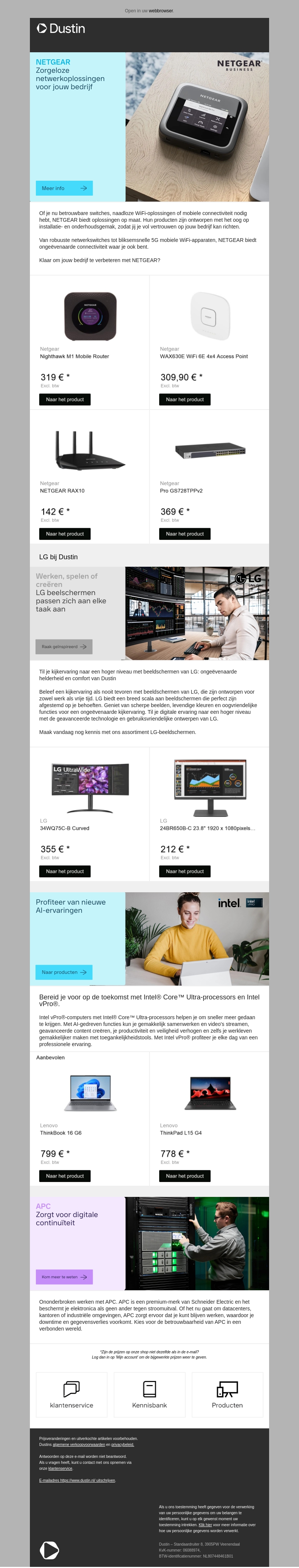 Ontdek de nieuwste NETGEAR netwerkoplossingen om jouw bedrijf te verbeteren. We bieden betrouwbare netwerkapparatuur, van de razendsnelle 5G mobiele router tot geavanceerde access points. Bekijk ook de hoogwaardige beeldschermen van LG en profiteer van de nieuwste AI-ervaringen met Intel® processors. Lees verder voor meer details en exclusieve aanbiedingen.