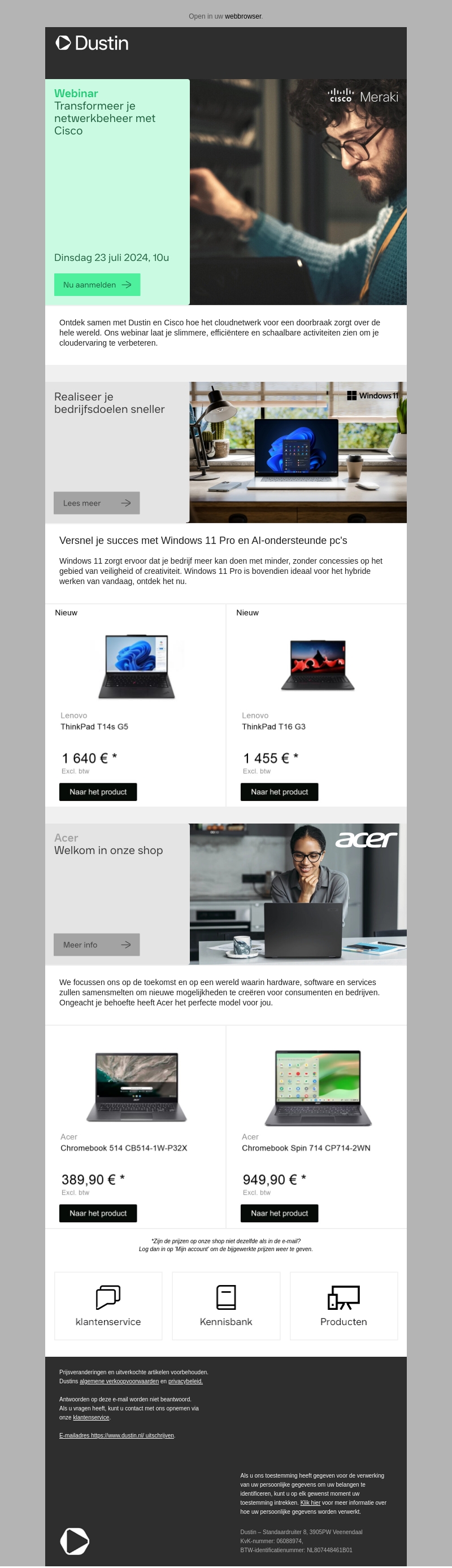 Neem deel aan ons exclusieve webinar en ontdek hoe je met Cisco je netwerkbeheer kunt transformeren. Leer over cloudnetwerk doorbraken met Dustin en Cisco en optimaliseer je bedrijfsactiviteiten.