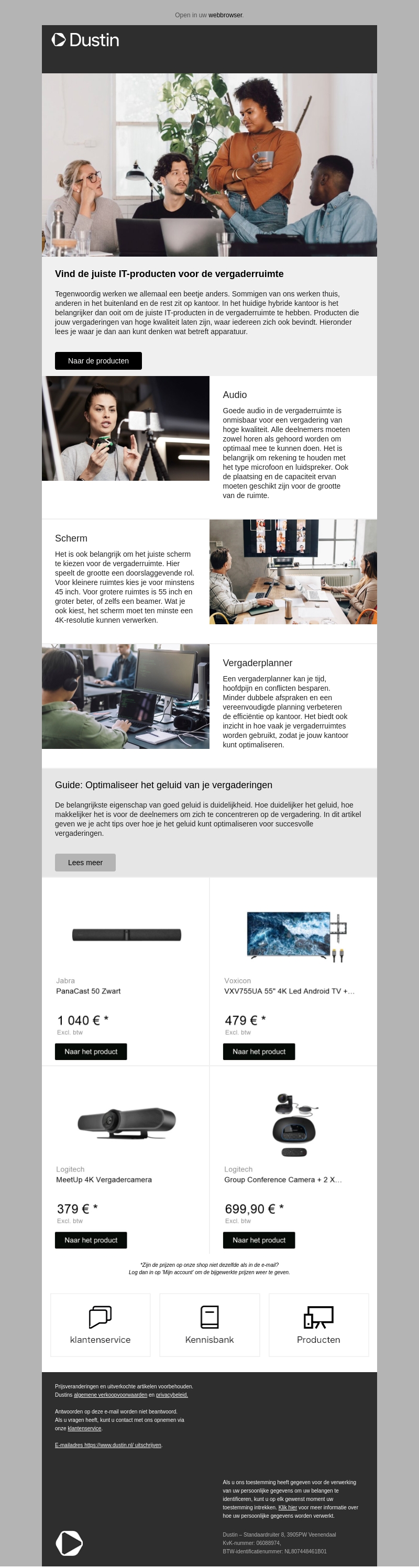 Ontdek de beste IT-producten voor je vergaderruimte. Zorg voor uitstekend geluid, het juiste scherm en een efficiënte vergaderplanner. Verbeter je hybride vergaderingen met deze essentiële tools.