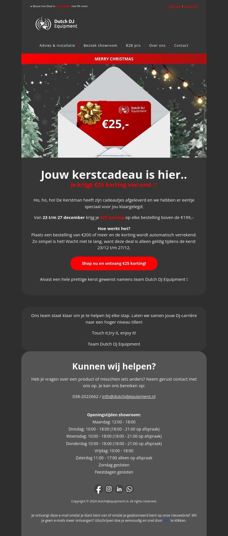 Vier kerst met een bijzonder cadeau van Dutch DJ Equipment. Profiteer van een directe korting van β¬25 op elke bestelling boven β¬199 van 23 tot en met 27 december. Maak je aankoop eenvoudig en snel om te genieten van deze feestelijke aanbieding.
