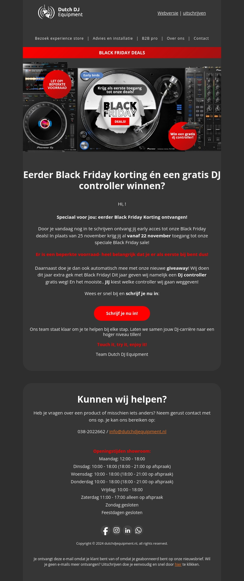 Mis geen enkele kans met de vroege toegang tot Black Friday kortingen bij Dutch DJ Equipment. Schrijf je nu in en profiteer van de beste deals vanaf 22 november. Daarnaast maak je kans op een gratis DJ controller! Zorg dat je er snel bij bent vanwege de beperkte voorraad. Dit is dé kans om jouw DJ-carrière naar een hoger niveau te tillen.
