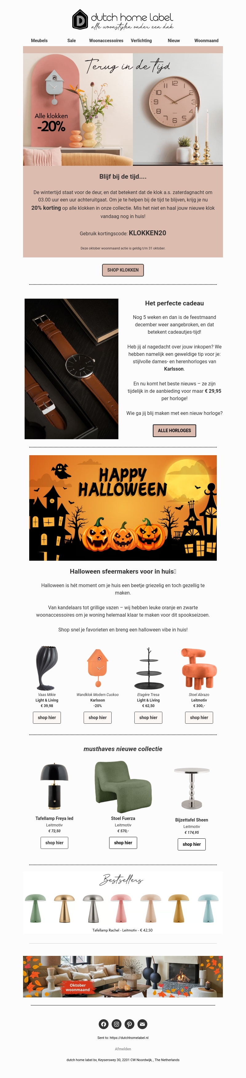 De wintertijd komt eraan en dat betekent extra voordeel bij Dutch Home Label. Ontvang 20% korting op alle klokken in onze collectie. Daarnaast bieden we geweldige Halloween sfeermakers om je huis in een griezelige sfeer te hullen. Mis de kans niet om je huis klaar te maken voor de feestdagen.