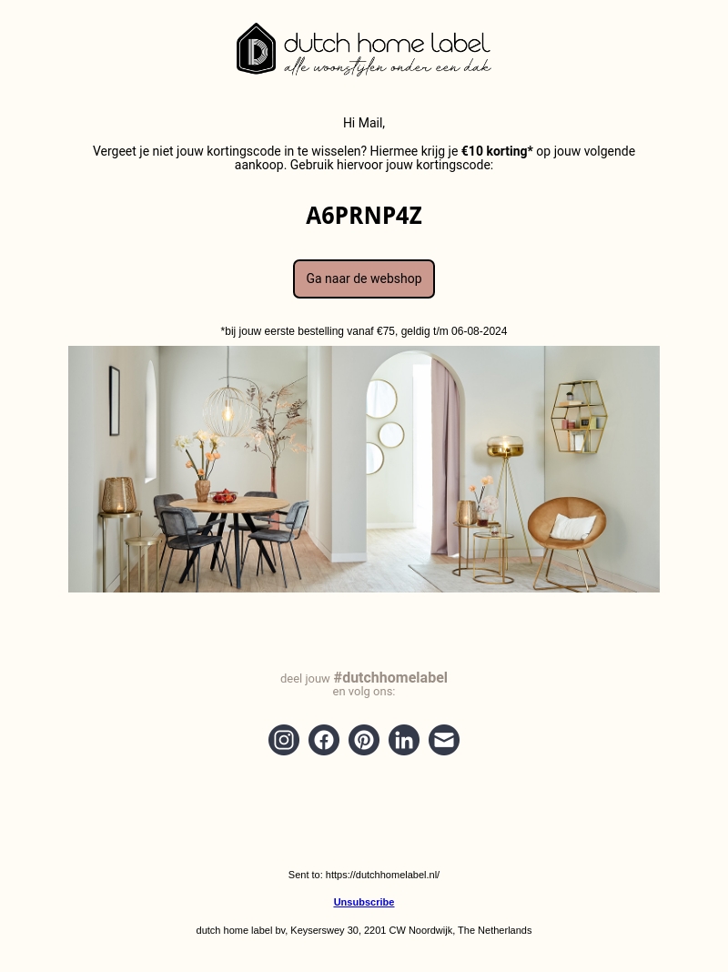 Vergeet niet jouw kortingscode in te wisselen bij Dutch Home Label! Hiermee krijg je €10 korting op je volgende aankoop. Gebruik de kortingscode A6PRNP4Z. Ga snel naar onze webshop!