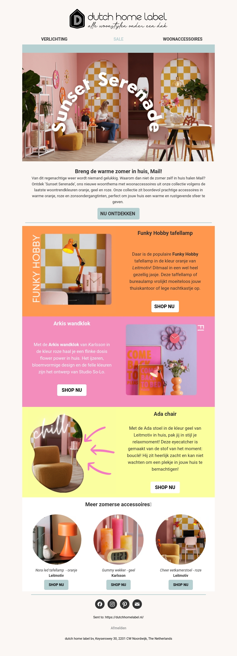 Dutch Home Label introduceert de 'Sunset Serenade' collectie. Laat je inspireren door woonaccessoires in warme tinten zoals oranje, roze en geel. Deze collectie is perfect om je huis deze zomer een rustgevende sfeer te geven. Ontdek producten zoals de Funky Hobby tafellamp, Arkis wandklok, en Ada stoel.